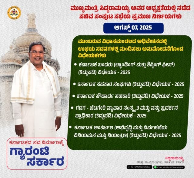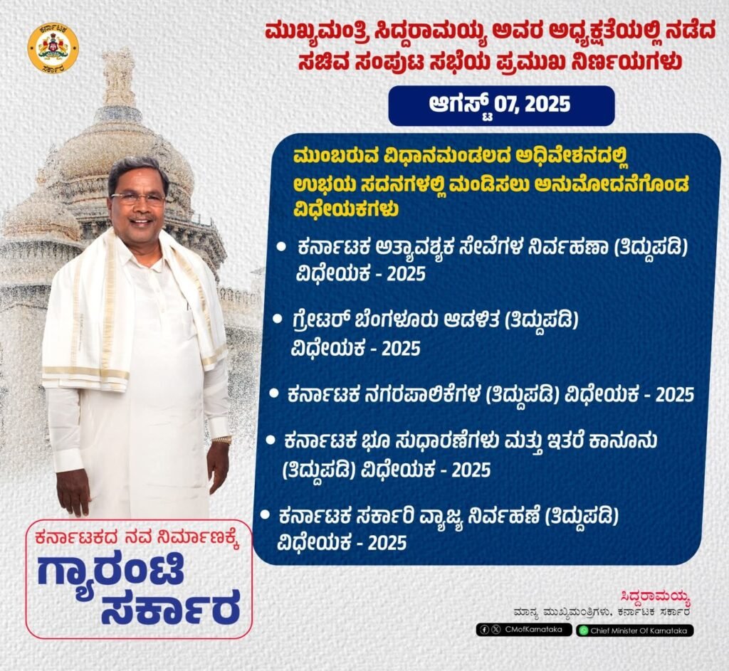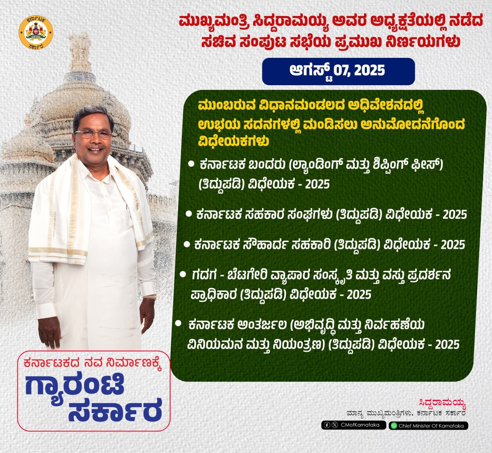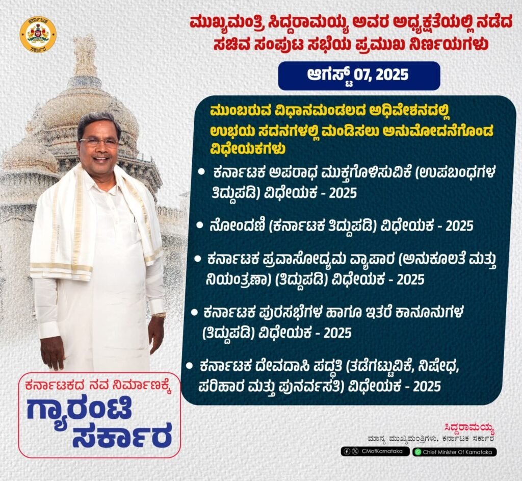 ಇಂದು ಕರ್ನಾಟಕ ಸರ್ಕಾರದ ಮುಖ್ಯಮಂತ್ರಿ ಸಿದ್ದರಾಮಯ್ಯ ಅವರ ಅಧ್ಯಕ್ಷತೆಯಲ್ಲಿ ನಡೆದ ಸಚಿವ ಸಂಪುಟ ಸಭೆಯ ಪ್ರಮುಖ ನಿರ್ಣಯಗಳು ಹೀಗಿವೆ..