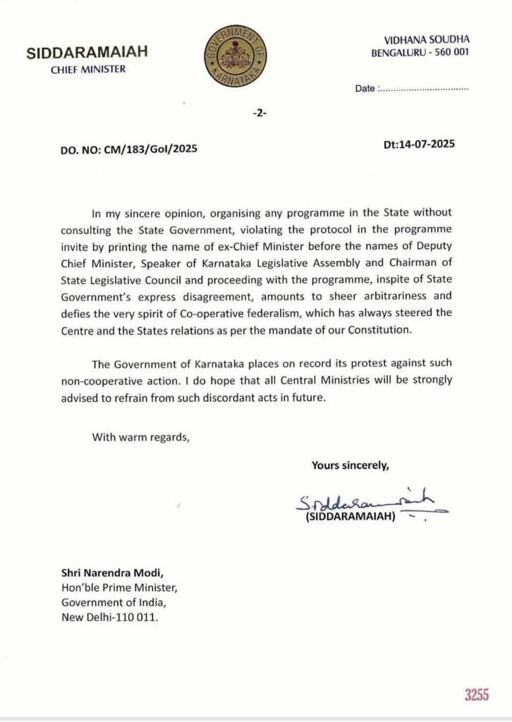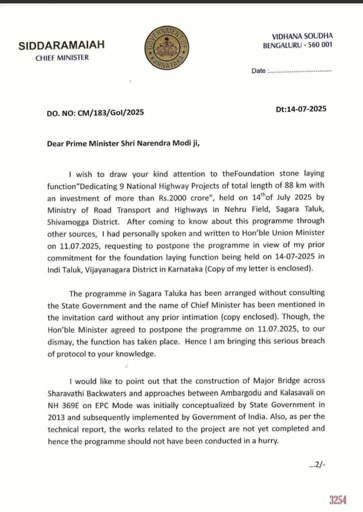 ಶಿವಮೊಗ್ಗ ಜಿಲ್ಲೆಯ ಸಾಗರದಲ್ಲಿ ಕೇಂದ್ರ ಸರ್ಕಾರದ ಭೂಸಾರಿಗೆ ಮತ್ತು ಹೆದ್ದಾರಿ ಇಲಾಖೆ ಹಾಗೂ ರಾಷ್ಟ್ರೀಯ ಹೆದ್ದಾರಿ ಪ್ರಾಧಿಕಾರವು ಆಯೋಜಿಸಿದ್ದ ಸಮಾರಂಭದಲ್ಲಿ ಶಿಷ್ಟಾಚಾರ ಉಲ್ಲಂಘನೆಯಾಗಿರುವ ಬಗ್ಗೆ ಪ್ರಧಾನಿ Narendra Modi ಅವರಿಗೆ ಮುಖ್ಯಮಂತ್ರಿ ಸಿದ್ದರಾಮಯ್ಯನವರು ಪತ್ರ ಬರೆದಿದ್ದಾರೆ