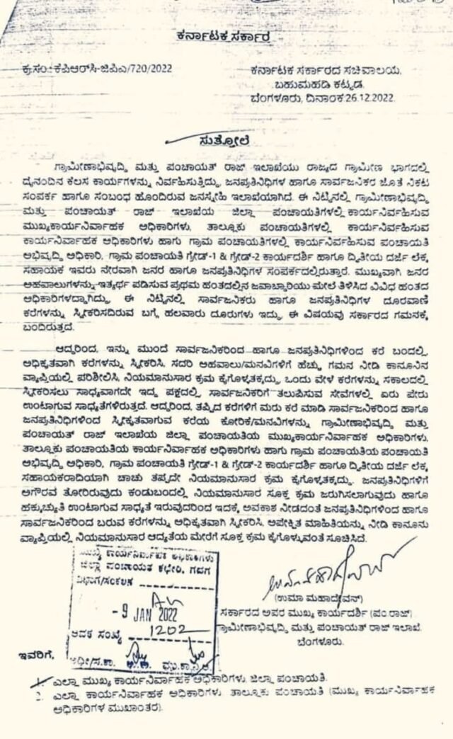 ಗ್ರಾಮೀಣ ಭಾಗದ ಜನರ ತೊಡಕುಗಳಿಗೆ ತಕ್ಷಣ ಸ್ಪಂದಿಸುವ ನಿಟ್ಟಿನಲ್ಲಿ ಕರ್ನಾಟಕ ಸರಕಾರದ ಗ್ರಾಮೀಣಾಭಿವೃದ್ಧಿ ಮತ್ತು ಪಂಚಾಯತ್ ರಾಜ್ ಇಲಾಖೆ ಒಂದು ಮಹತ್ವದ ಸುತ್ತೋಲೆಯನ್ನು ಹೊರಡಿಸಿದೆ.