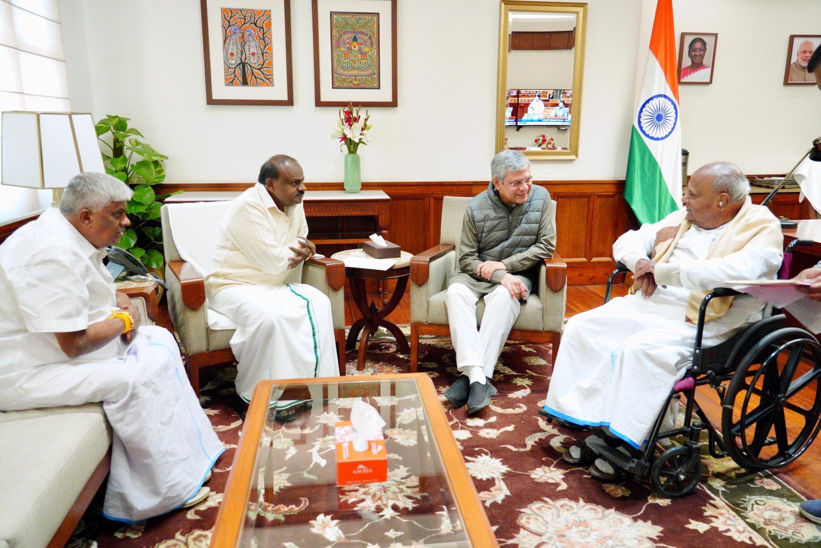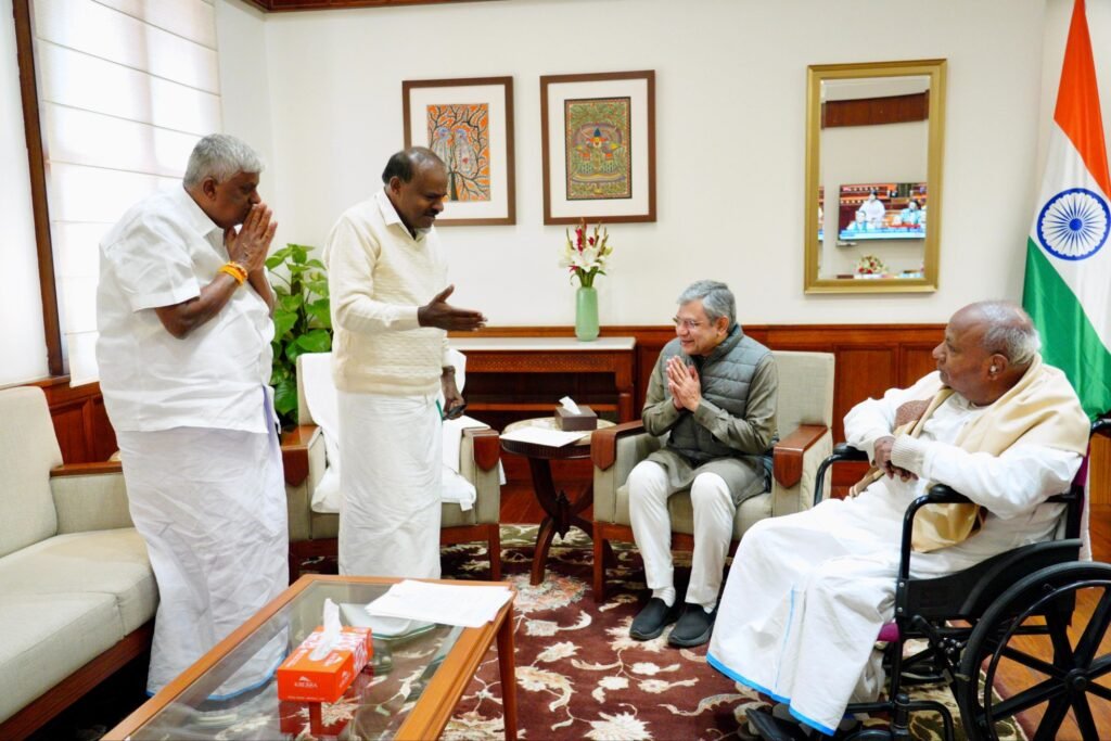 ಕೇಂದ್ರ ರೈಲ್ವೆ ಸಚಿವರಾದ ಅಶ್ವಿನಿ ವೈಷ್ಣವ್ ಅವರನ್ನು ನವದೆಹಲಿಯಲ್ಲಿಂದು ಮಾಜಿ ಪ್ರಧಾನಿ ಹೆಚ್.ಡಿ.ದೇವೇಗೌಡರು, ಕೇಂದ್ರ ಬೃಹತ್ ಕೈಗಾರಿಕೆ ಮತ್ತು ಉಕ್ಕು ಸಚಿವರಾದ ಹೆಚ್.ಡಿ.ಕುಮಾರಸ್ವಾಮಿ ಅವರು ಹಾಗೂ ಮಾಜಿ ಸಚಿವ ಮತ್ತು ಶಾಸಕರಾದ ಹೆಚ್.ಡಿ.ರೇವಣ್ಣ ಅವರು ಭೇಟಿ ಮಾಡಿ, ಹಾಸನ ಜಿಲ್ಲೆಯ ರೈಲ್ವೆ ಯೋಜನೆಗಳ ಬಗ್ಗೆ ಮನವಿ ಮಾಡಿದರು.