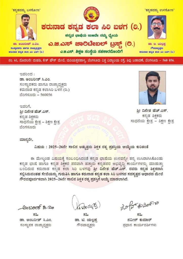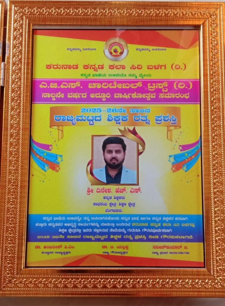 💐ಸಾಧಕರಿಗೆ ಸನ್ಮಾನ 💐 ಎ. ಜಿ. ಎಸ್ ಚಾರಿಟಬಲ್ ಟ್ರಸ್ಟ್ (ರಿ ) ಬೆಂಗಳೂರು… ಇವರ ನಾಲ್ಕನೇ ವರ್ಷದ ಅದ್ದೂರಿ ವಾರ್ಷಿಕೋತ್ಸವ ಸಮಾರಂಭದ ಪ್ರಯುಕ್ತ ಶ್ರೀಯುತರಾದಂತಹ ಶ್ರೀ ಎಚ್.ಎಸ್. ದಿನೇಶ್ ರವರು ಹುಲ್ಲೇ ಕೆರೆ ಗ್ರಾಮ ಗಂಡಸಿ. ಹೋಬಳಿ ಅರಸೀಕೆರೆ. ತಾಲ್ಲೋಕು ಹಾಸನ. ಜಿಲ್ಲೆಯವರಾದ ಇವರು ಕನ್ನಡ ಭಾಷೆ ನೆಲ ಜಲ ಹಾಗೂ ಕನ್ನಡ ಶಿಕ್ಷಕರ ಪರವಾಗಿ ಹಾಗೂ ಕನ್ನಡದ ಪರವಾಗಿ ಉತ್ತಮವಾಗಿ ಕಾರ್ಯಗಳನ್ನು ಮಾಡುತ್ತಾ ಬಂದಿರುವ ಇವರಿಗೆ 🌹ಕರುನಾಡ ಕನ್ನಡ ಕಲಾ ಸಿರಿ ಬಳಗ🌹 (ರಿ) ಬೆಂಗಳೂರು….. ಇವರು ಶಿಕ್ಷಣ ಕ್ಷೇತ್ರದಲ್ಲಿ ಸಲ್ಲಿಸಿರುವ ಅಪಾರವಾದ ಸೇವೆಯನ್ನು ಗುರುತಿಸಿ ಗೌರವಪೂರ್ವಕವಾಗಿ 2025-26 ನೇ ಸಾಲಿನ ರಾಜ್ಯ ಮಟ್ಟದ 💐 ಶಿಕ್ಷಕ ರತ್ನ 💐 ಪ್ರಶಸ್ತಿಯನ್ನು ನೀಡಿ ಗೌರವಿಸಲಾಗಿದ್ದು 🌷 ಹೊಯ್ಸಳ ವಿಜಯ 🌷 ಪತ್ರಿಕೆ ಹಾಗೂ H V news channel 🌹ಶಿಕ್ಷಕ ರತ್ನ 🌹 ಪ್ರಶಸ್ತಿ ವಿಜೇತ ಶ್ರೀಯುತ ಎಚ್.ಎಸ್ ದಿನೇಶ್ ರವರನ್ನು ಅಭಿನಂದಿಸುತ್ತಾರೆ